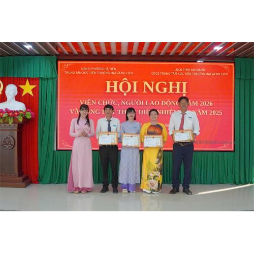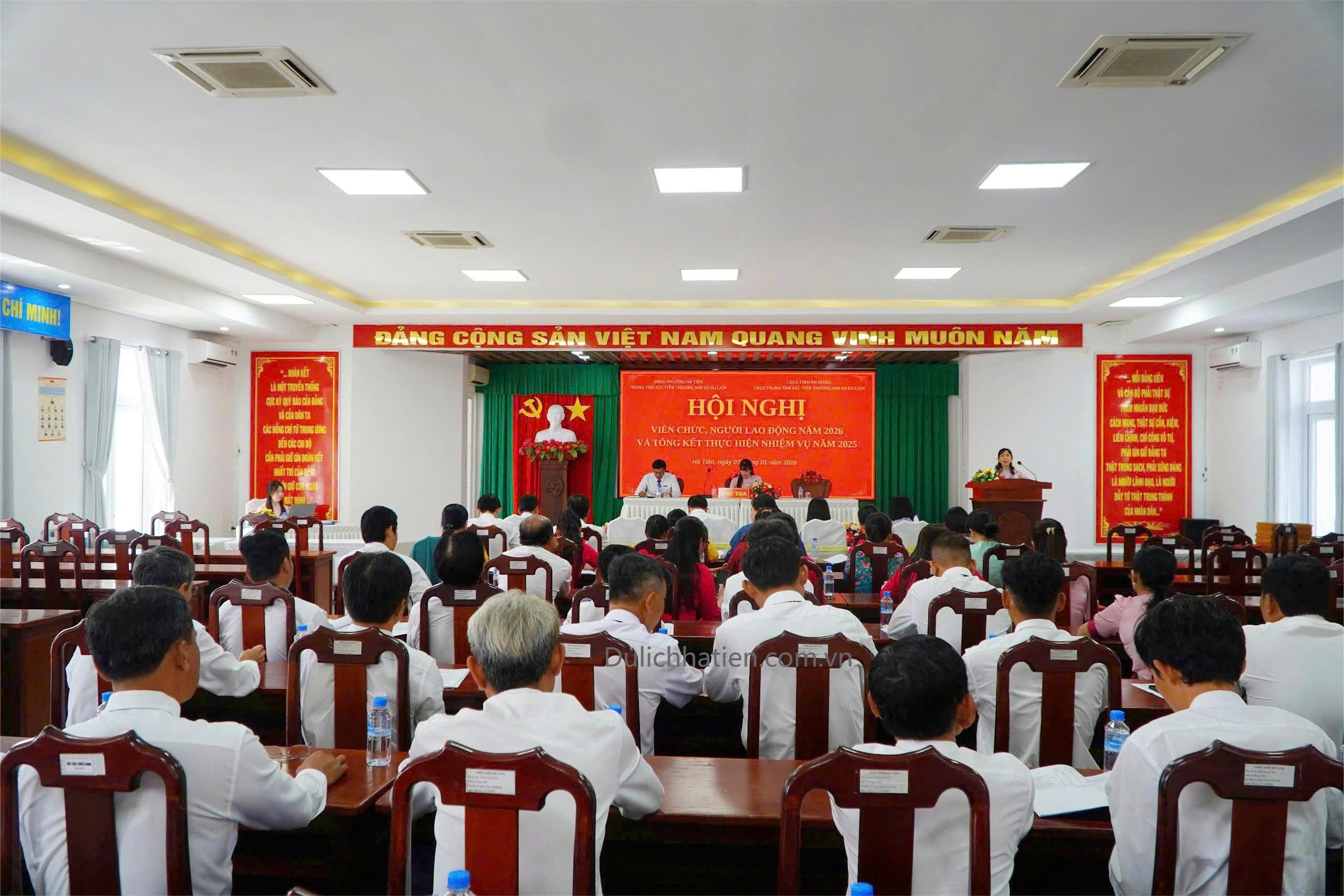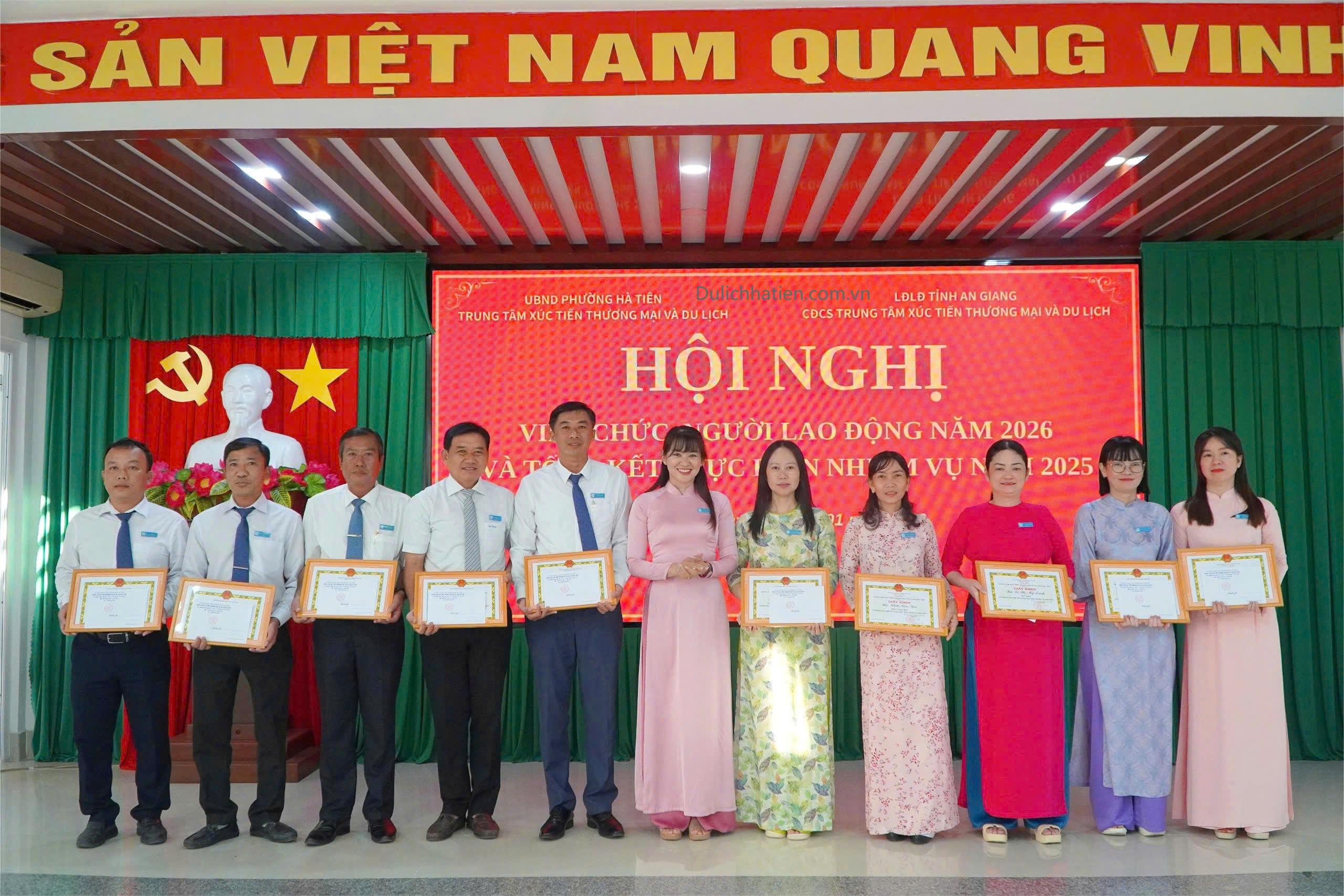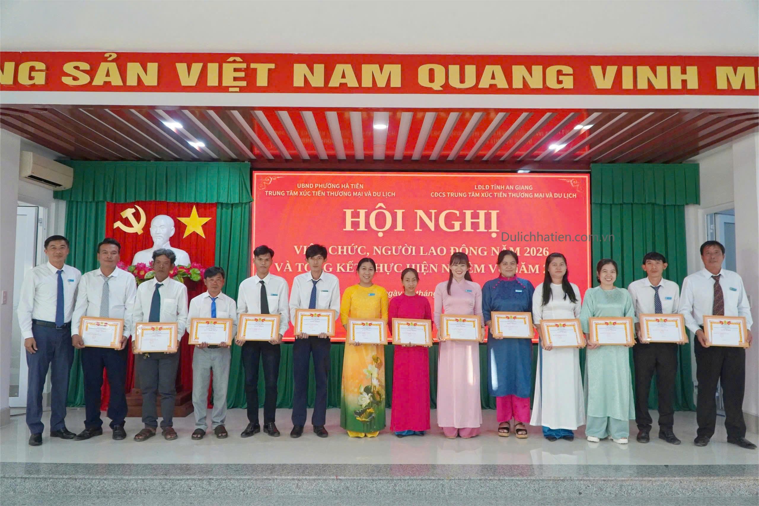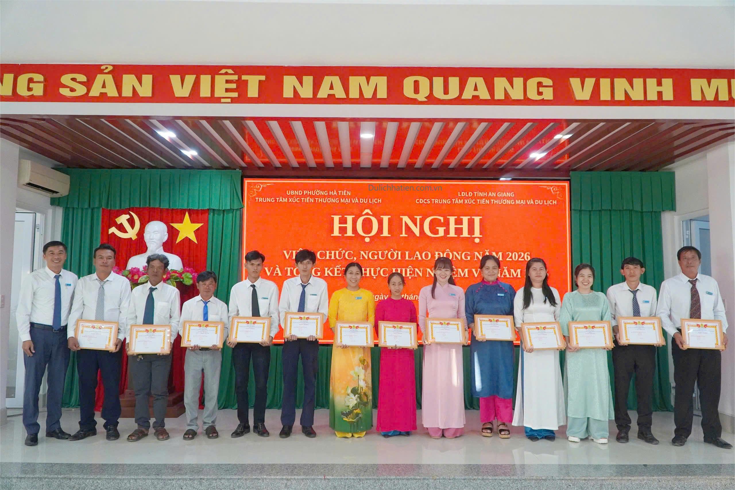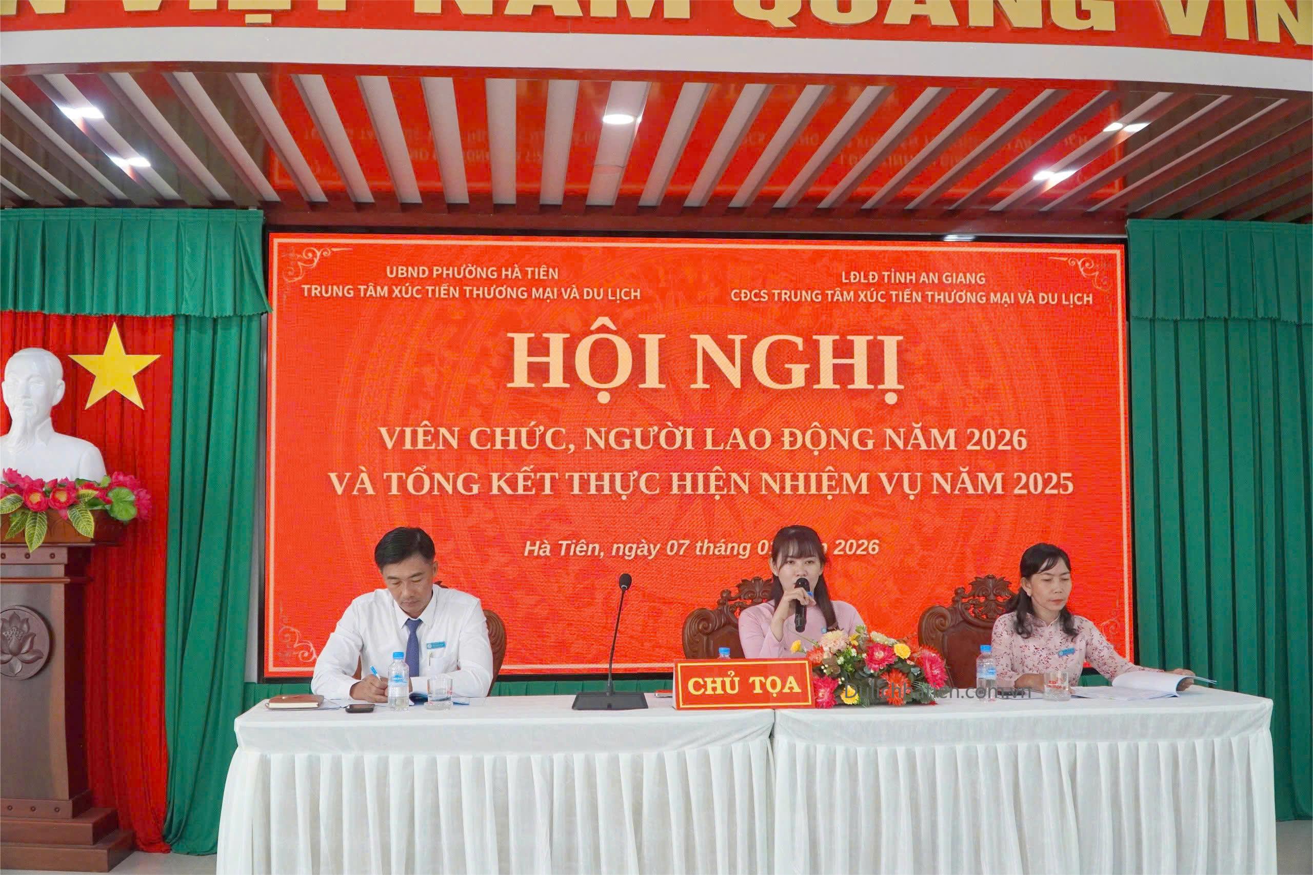Chiều ngày 07/01, Trung tâm Xúc tiến Thương mại và Du lịch Hà Tiên tổ chức Hội nghị viên chức, người lao động năm 2026 và tổng kết thực hiện nhiệm vụ năm 2025. Tham dự hội nghị có các đồng chí: Nguyễn Thị Mộng Quyên - Bí thư Chi bộ, Giám đốc Trung tâm; Bùi Đăng Khoa - Phó Bí thư Chi bộ, Phó Giám đốc Trung tâm; Khưu Kim Yên - Phó Giám đốc Trung tâm, Chủ tịch Công đoàn cơ sở; Lý Trường Sang - Phó Giám đốc Trung tâm, cùng toàn thể viên chức, người lao động trong đơn vị.