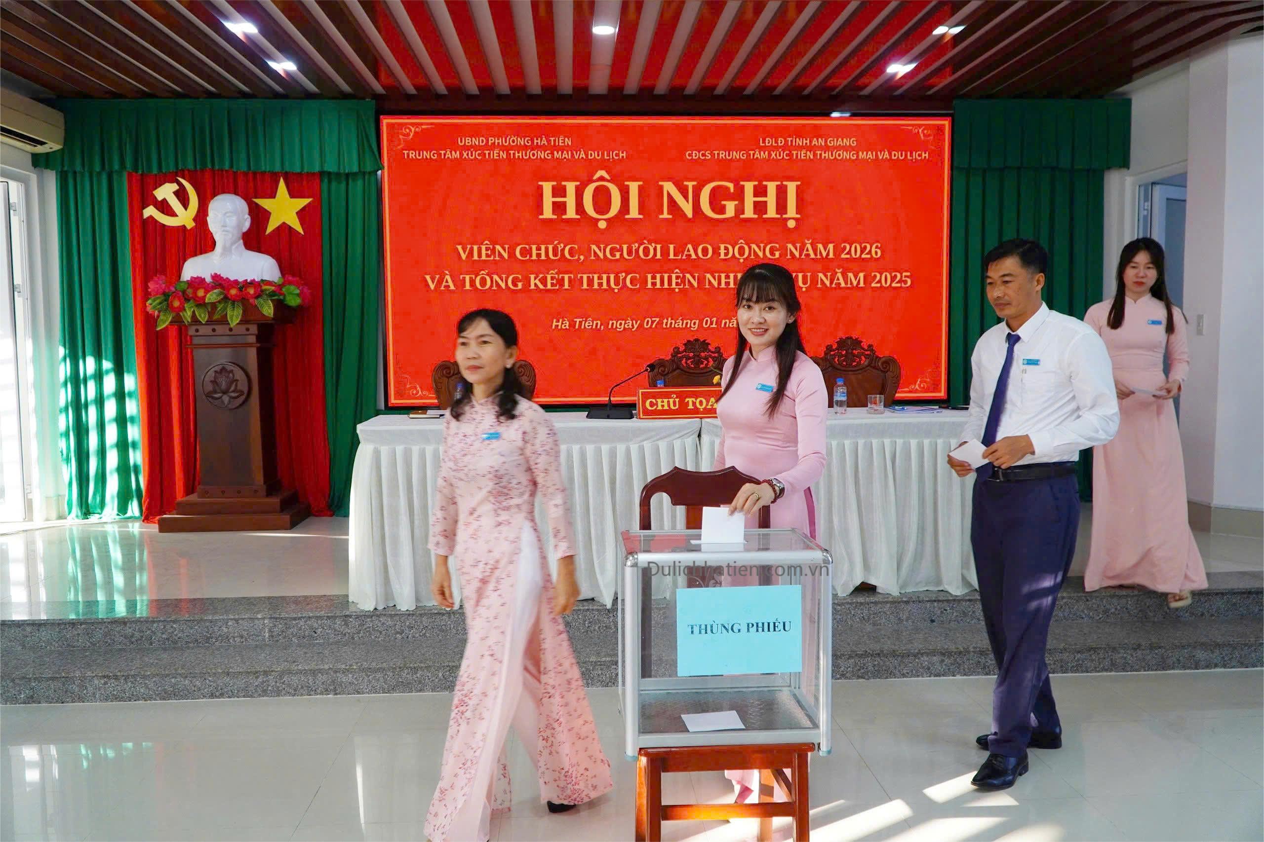Hội nghị đã thông qua Nghị quyết Hội nghị viên chức, người lao động năm 2026 với sự thống nhất cao, làm cơ sở để Trung tâm Xúc tiến Thương mại và Du lịch Hà Tiên triển khai hiệu quả các nhiệm vụ trong thời gian tới.