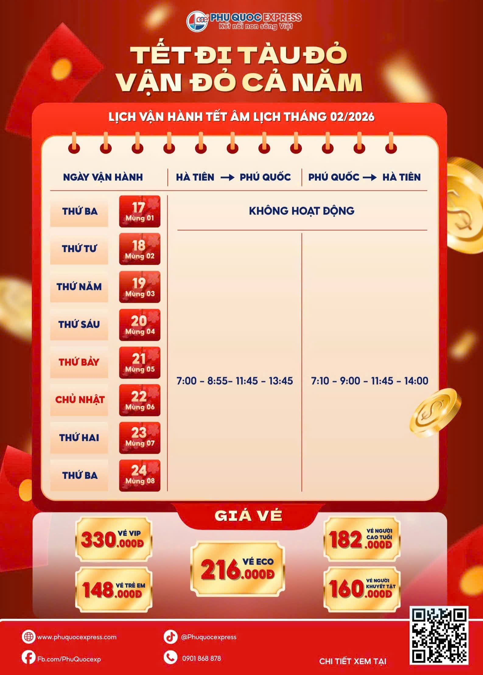 - Mùng 01 Tết (17/02/2026): Tàu không hoạt động.