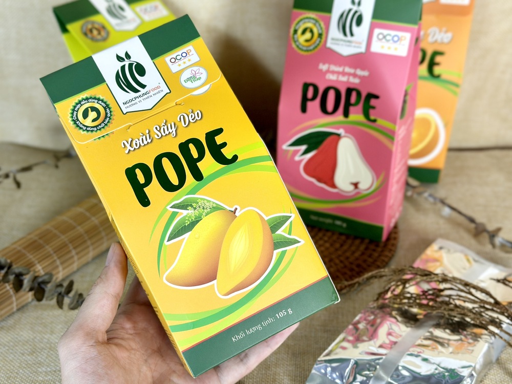 Sản phẩm đã được chứng nhận OCOP 3 sao, khẳng định chất lượng và uy tín trên thị trường. Không chứa chất bảo quản, Xoài Sấy Dẻo POPE là sự lựa chọn an toàn tuyệt đối cho sức khỏe người tiêu dùng, phù hợp với mọi lứa tuổi, từ trẻ em đến người lớn. Với thiết kế bao bì tiện lợi, sản phẩm dễ dàng mang theo khi đi làm, đi học, hay trong những chuyến du lịch, là món ăn vặt lý tưởng cho những ai yêu thích sự tiện lợi trong chế độ ăn uống mà vẫn đảm bảo hương vị thơm ngon và lành mạnh.